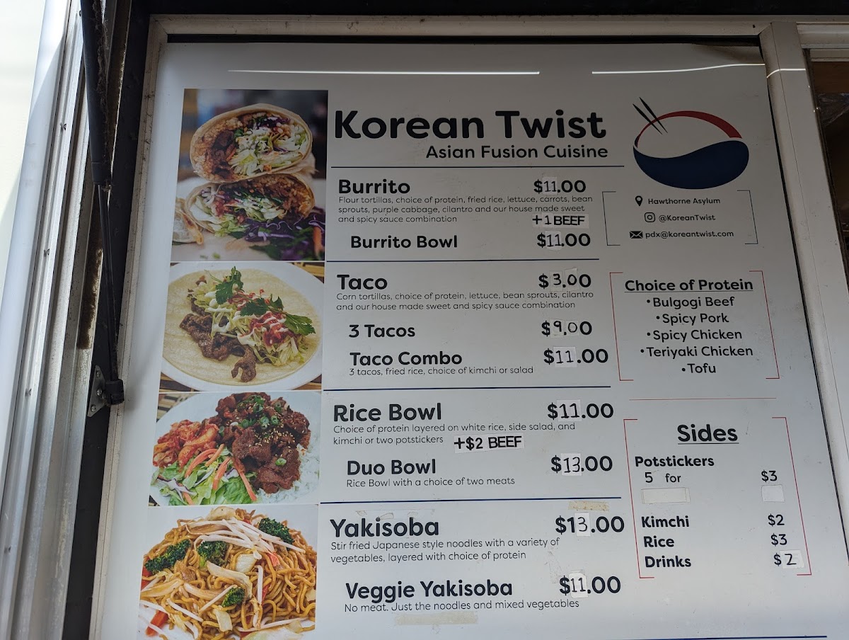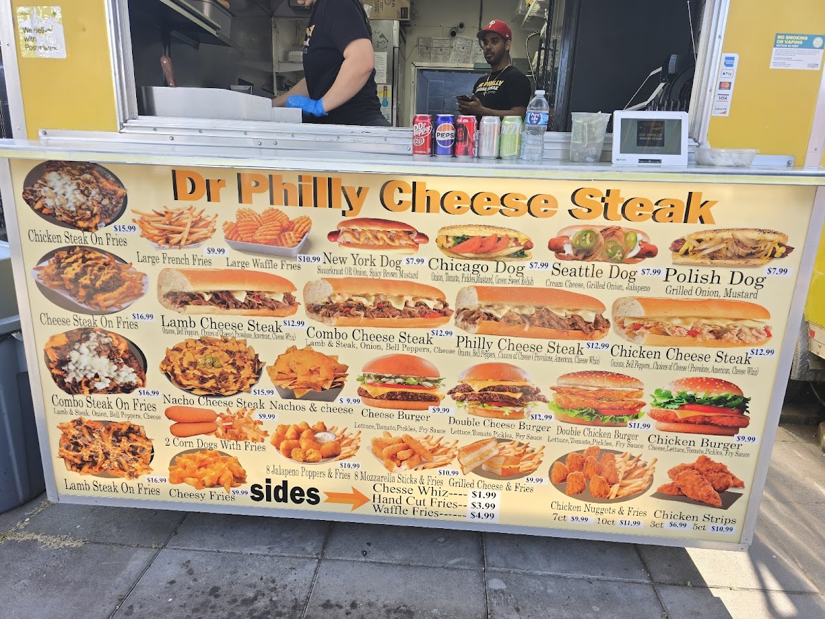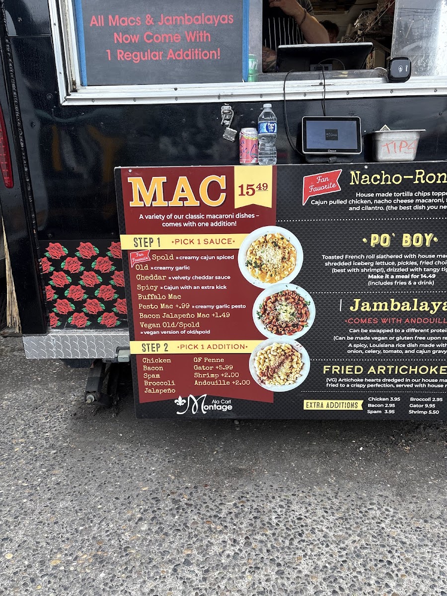 In addition to these, menu highlights include a variety of internationally influenced street foods such as Fish and Chips, Chicago Dog, Pad Thai, Bibimbap, Dumplings, and Jambalaya, alongside popular options like Hot Dogs and the Thai Chili Burger.