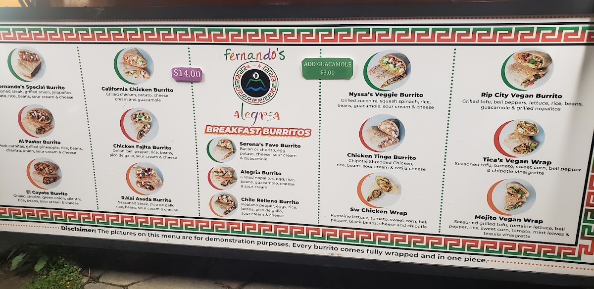 The menu offers a diverse selection of food and drink options organized into distinct categories to suit various dining preferences throughout the day. Visitors can find breakfast items such as burritos featuring ingredients like eggs, cheese, potatoes, beans, and various proteins including bacon, chorizo, and tofu. Vegan options are also available within this category.
