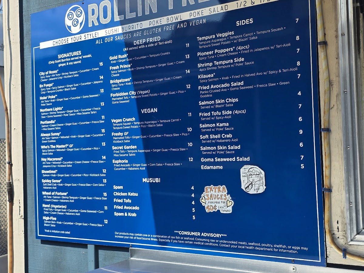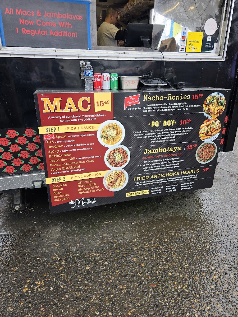 Beverage choices feature draft beer, providing options to complement the food selections. The menu is suitable for breakfast, casual meals, and snacks throughout the day, with an ordering system designed for quick and easy service, allowing guests to order from multiple food carts and conveniently pick up their selections.