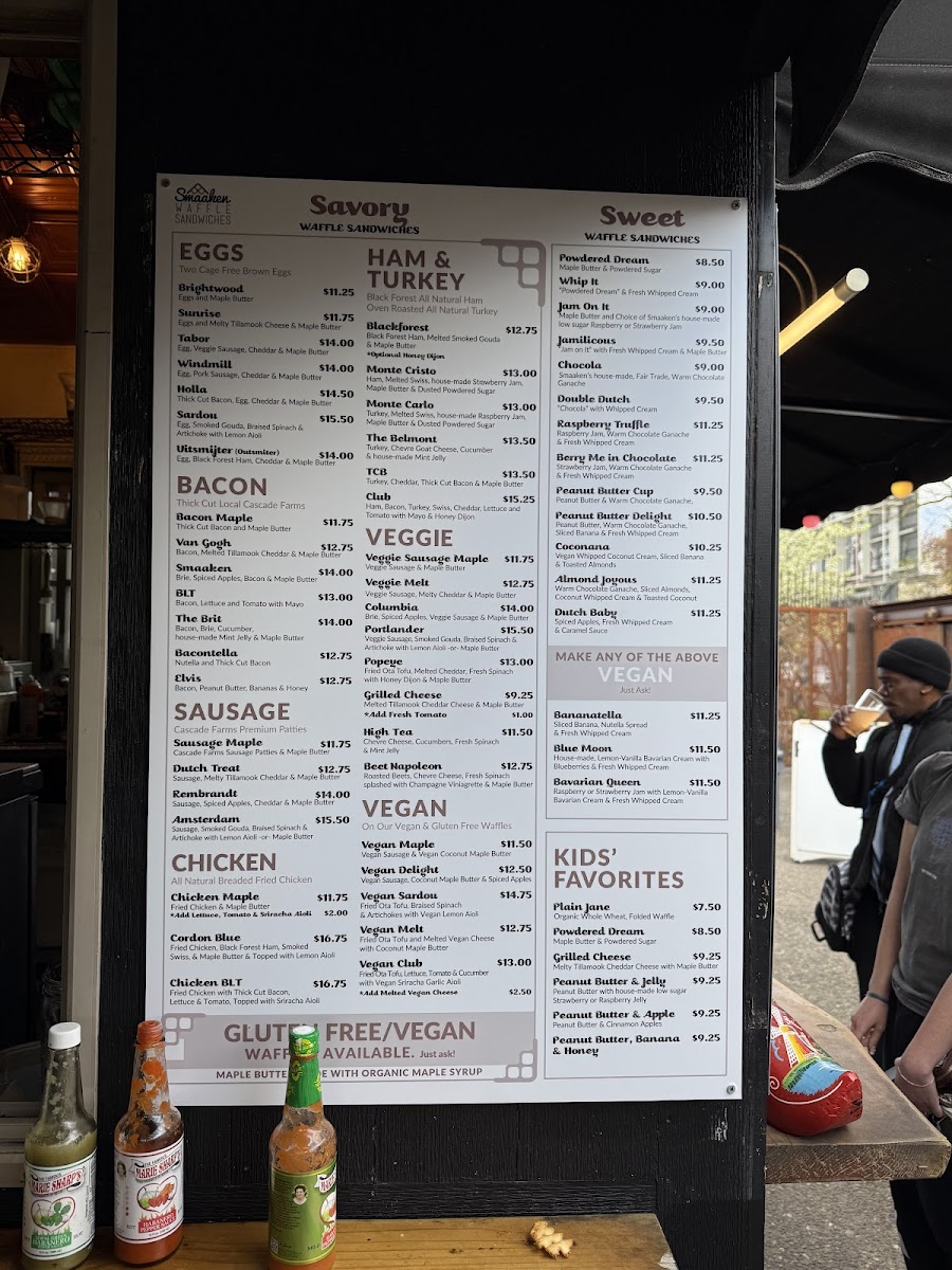 For savory dishes, the menu includes a range of sausage options accompanied by unique toppings such as melty cheddar, spiced apples, smoked gouda, and maple butter. A sweet section offers items like maple butter and powdered sugar treats, whipped cream accompaniments, housemade warm chocolate, and selections featuring jams and chocolate ganache.
